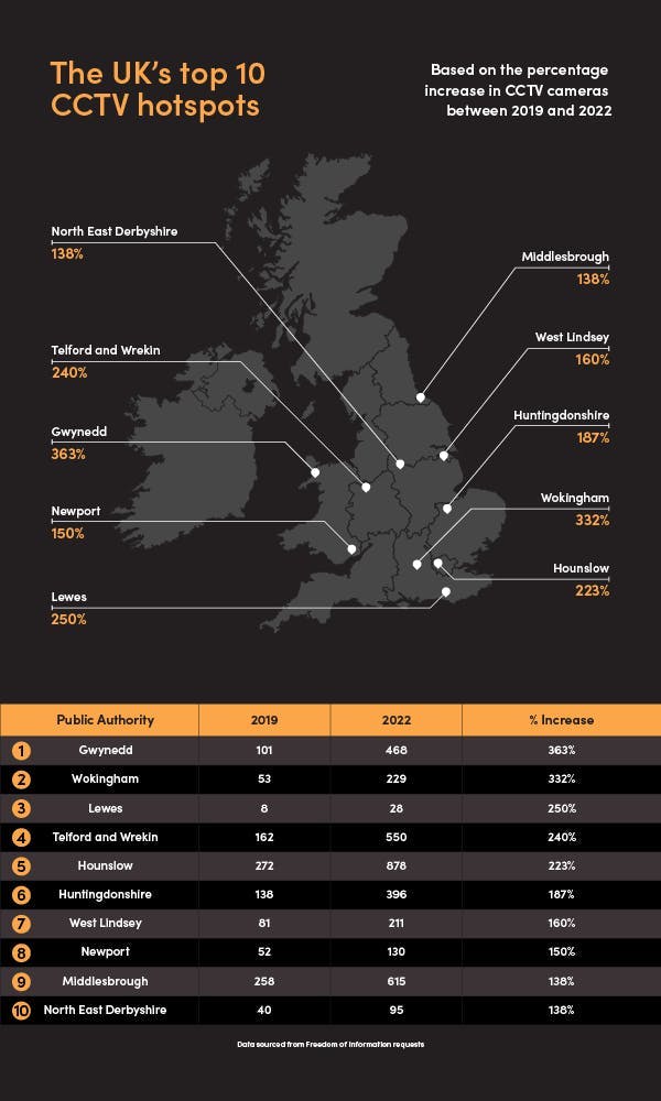 The UK local authorities that are increasing their CCTV presence at the greatest speed are: