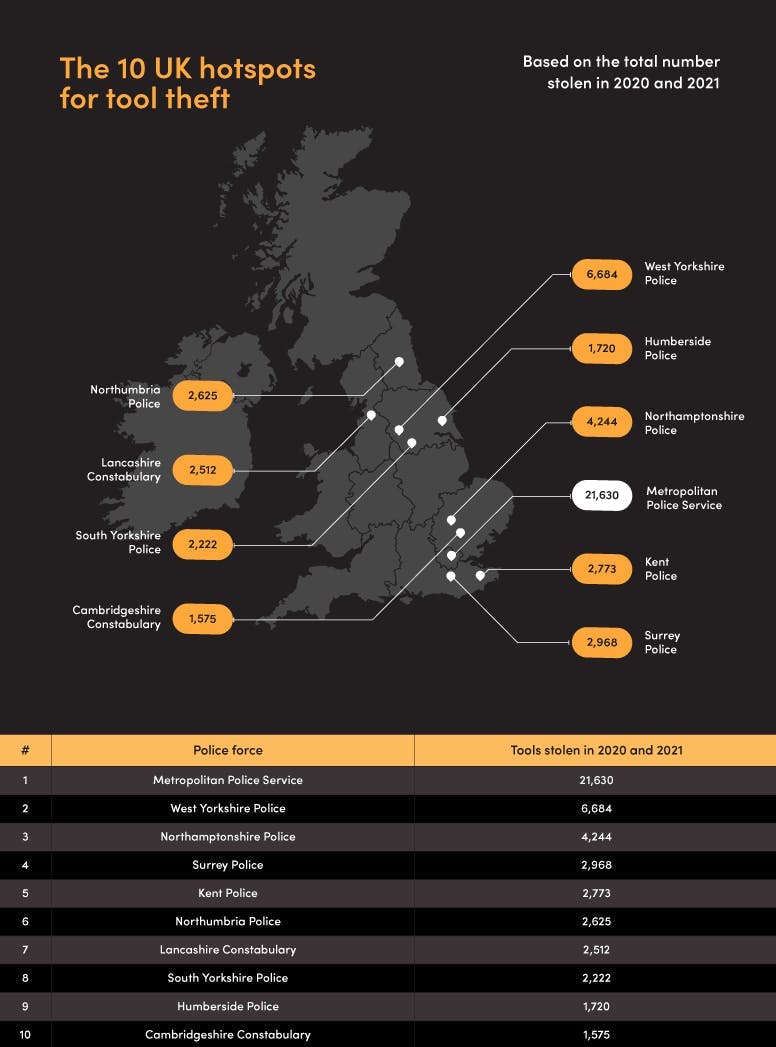 The most valuable tools were stolen from West Yorkshire, where over £50 million of equipment was taken between 2020 and 2021.