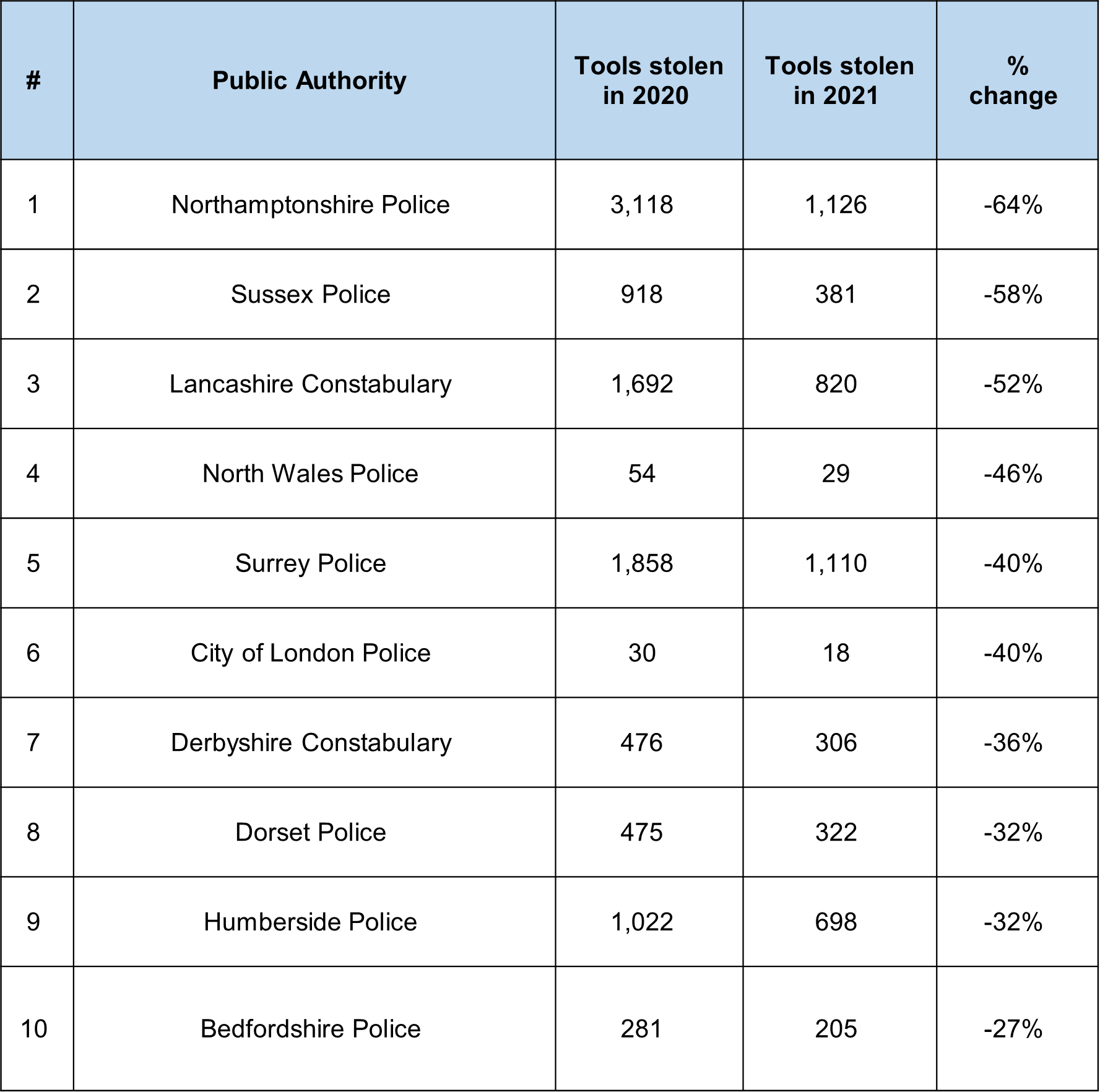 The ten UK police forces that are experiencing the biggest decreases in tool theft are: