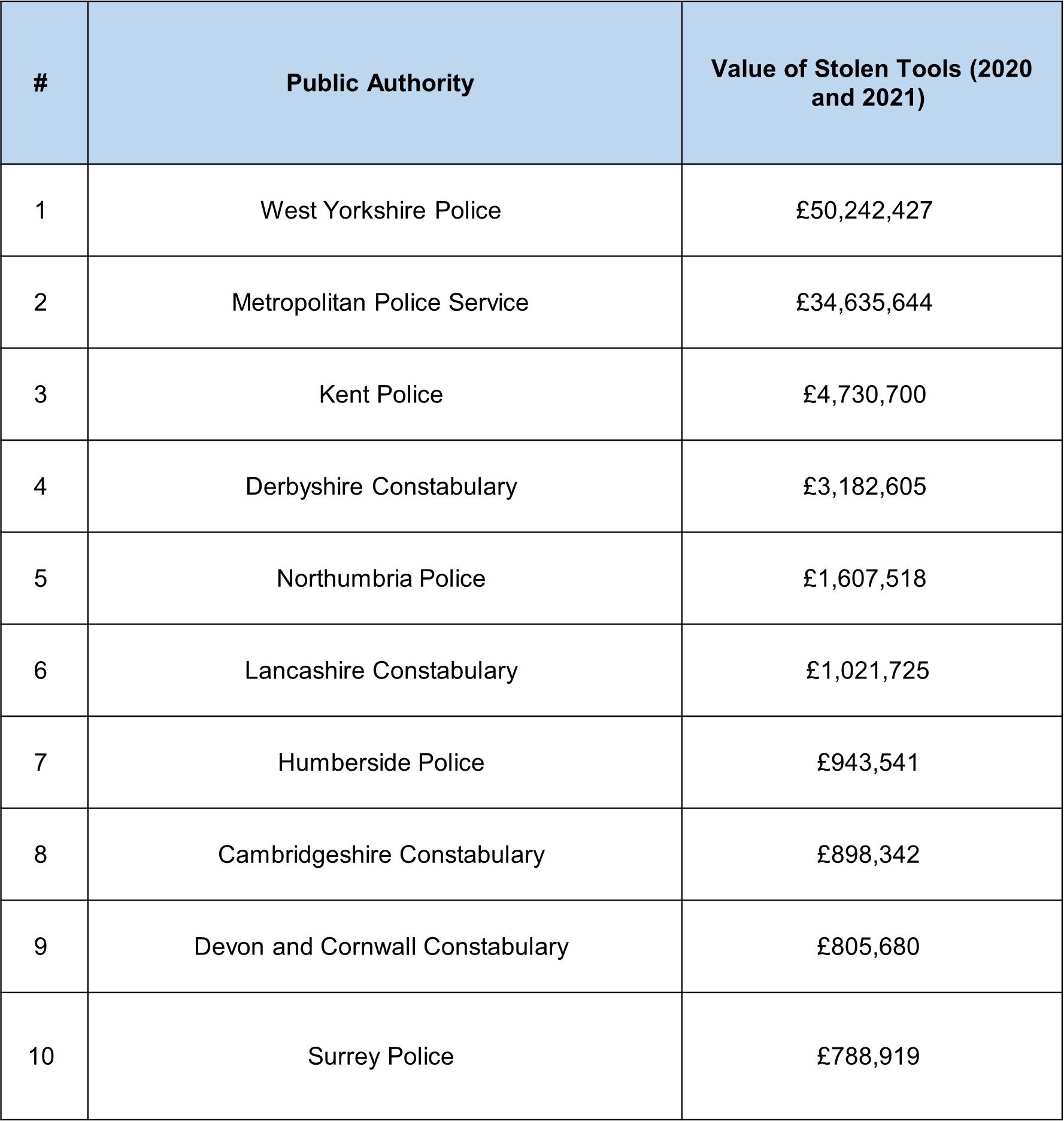 The 10 police forces with the highest value of stolen tools are: